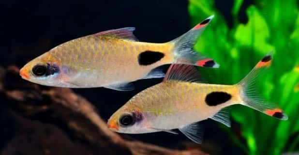 The Mascara Barb (Dawkinsia assimilis) is a striking freshwater fish from India, known for the bold black "mascara-like" stripe near its eye. It's a peaceful and attractive addition to aquariums.